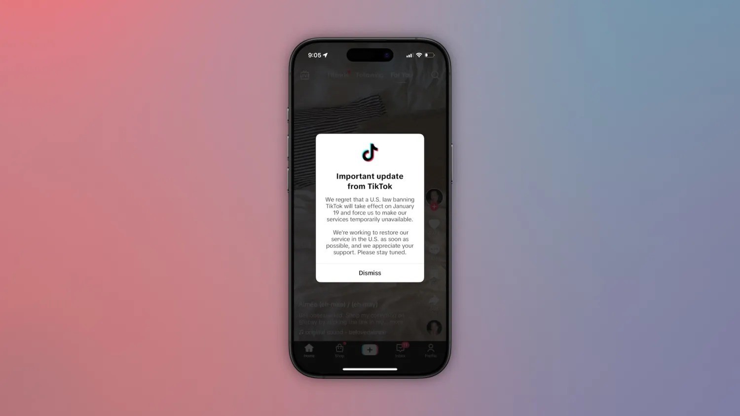 通知内容显示:我们很遗憾,一项封禁TikTok的美国法律将于1月19日生效,并迫使我们暂时停止提供服务。我们正尽快努力在美国恢复我们的服务,我们感谢各位的支持。请保持关注。